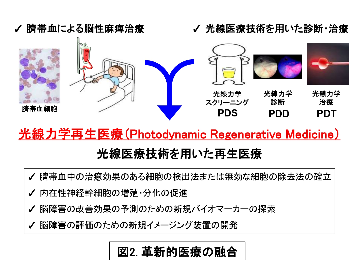 脳性麻痺治療に用いられる臍帯血細胞は、様々な血球細胞が含まれており、その中でどの細胞が治療効果を示すのかはまだ明らかにされていません。そこで、5-ALAを使って特定の細胞を可視化できるようにし、細胞特性を詳しく調べています。臍帯血中には様々な幹細胞が存在することも報告されており、これらの細胞を簡便に同定できるのではないかと考えています。治療効果を示す細胞を臍帯血中から見つけ出し、また培養方法を確立することで、採取細胞数が限られるという臍帯血再生医療の課題を克服できるかもしれません。また、細胞製剤などにも応用可能となります。高知大学オリジナルの研究を融合し、新たな治療法や診断法の開発につなげていくことを目指しています(図2)。