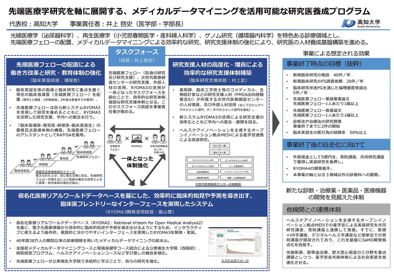 また、この基盤は、単なる研究のためのツールにとどまらず、若手医師や学生も容易にアクセスできるシステムとなることから、教育の現場においても活用されます。臨床と研究がシームレスに結びつくことで、「現場から生まれる研究」「研究が還元される現場」という好循環を実現し、高度医療人材の育成に寄与します。高知大学が誇るデータ駆動型研究の象徴的な取り組みとなります。